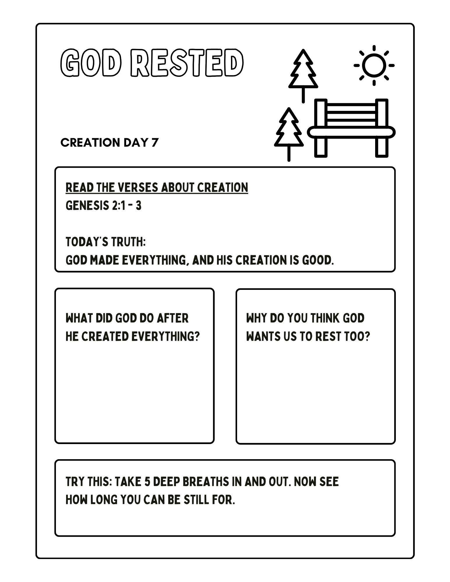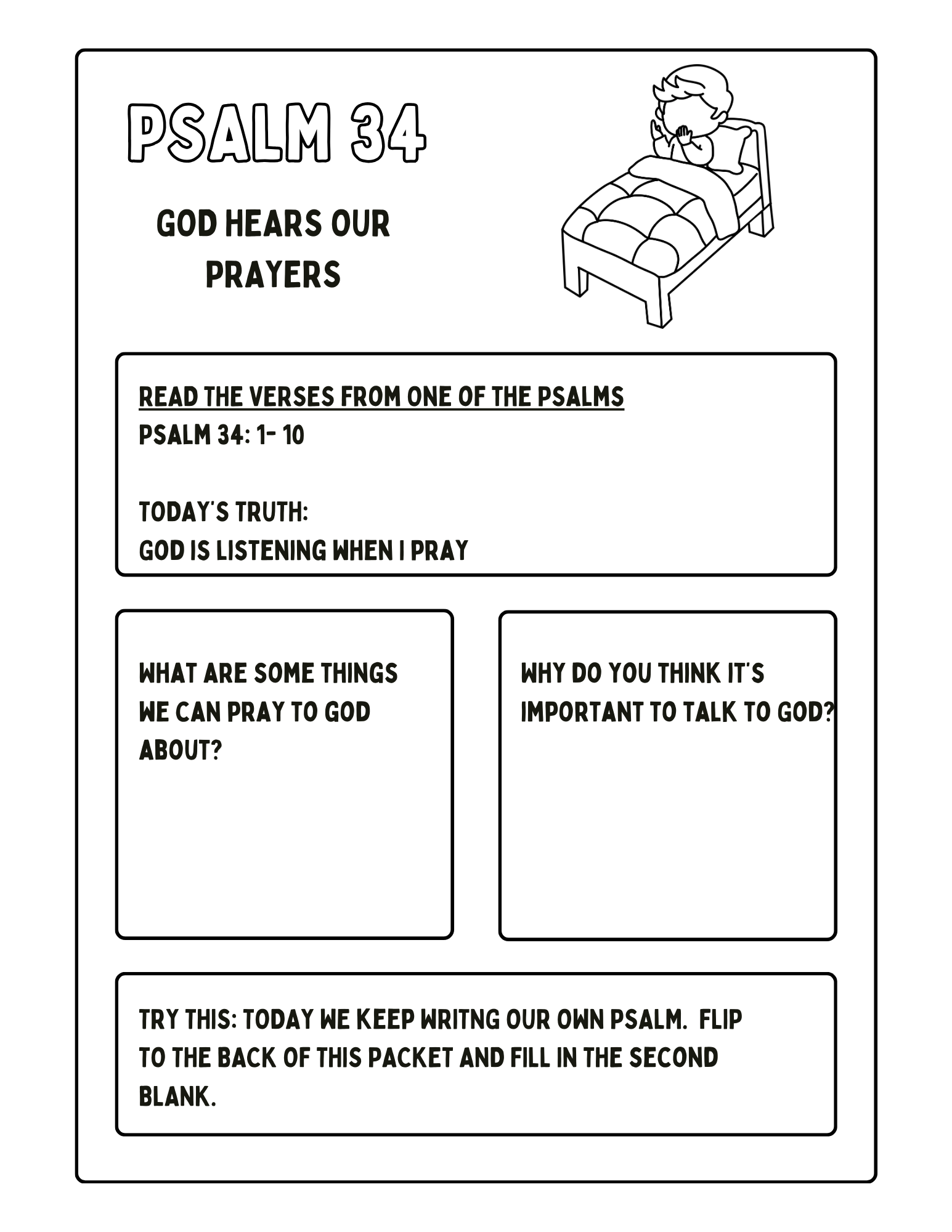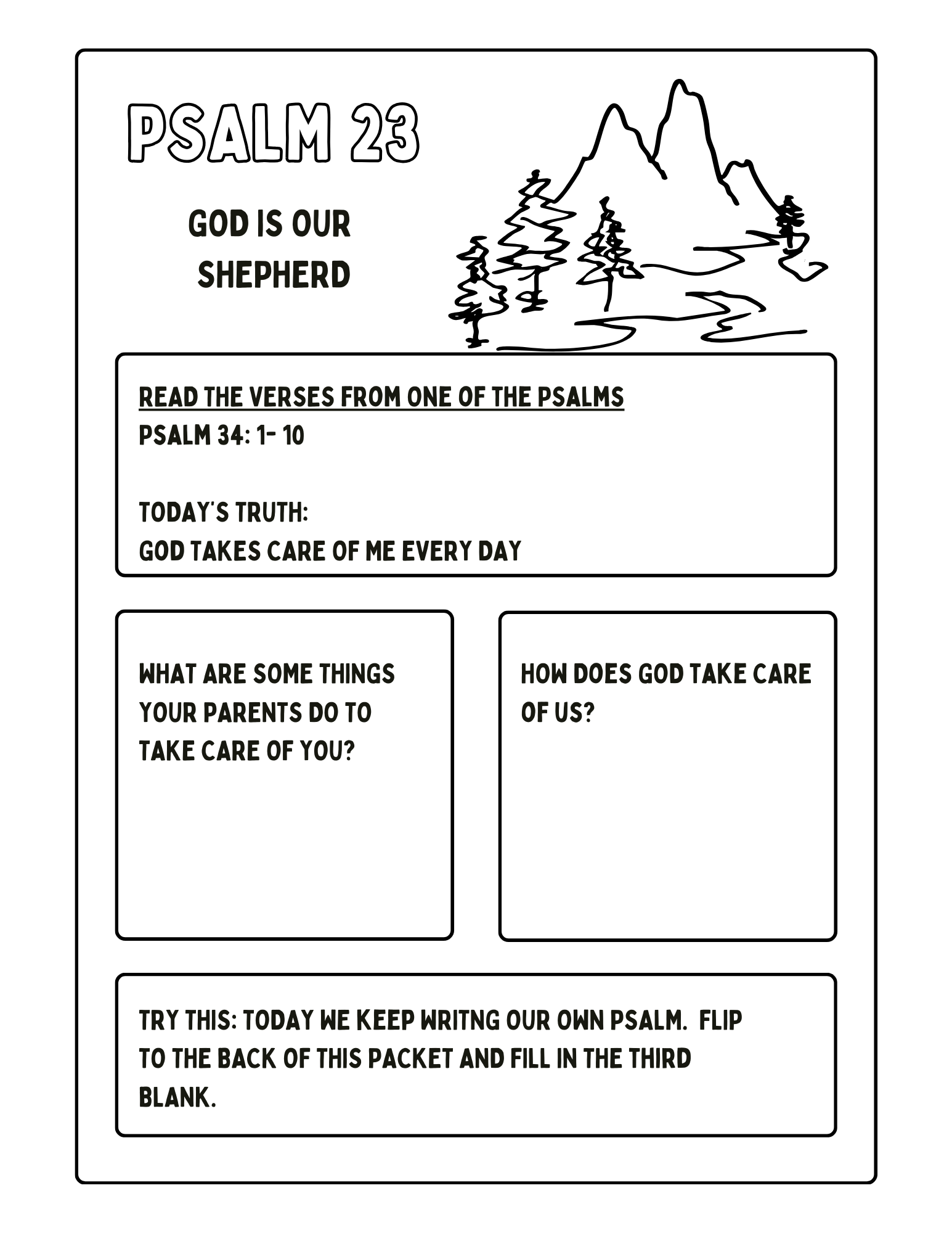 Each child will receive a weekly reading packet (pick up at the check in desk or download pages below) for all four weeks, along with a special Bible Buddy squishy animal to remind them to slow down, focus, and enjoy time in Scripture. Kids can read on their own or have a parent read with them, then answer a few simple questions to reflect on what they’ve learned.